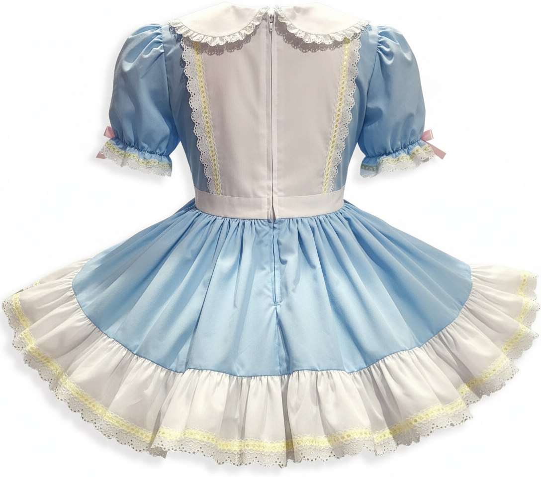Adult Sissy toddler-style dress with Care Bear applique in blue and white
