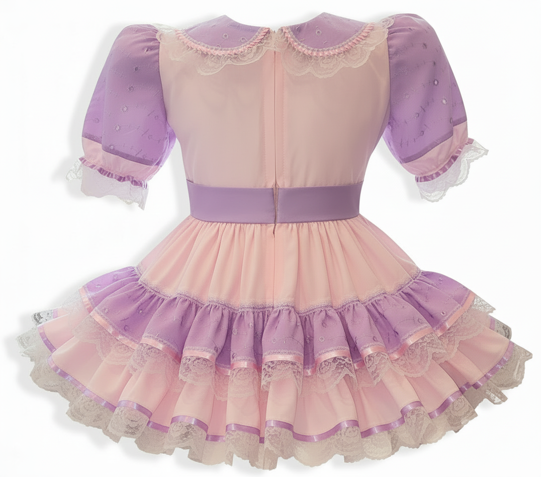 *Trimmed with white lace, pink and purple satin ribbon, and a bow