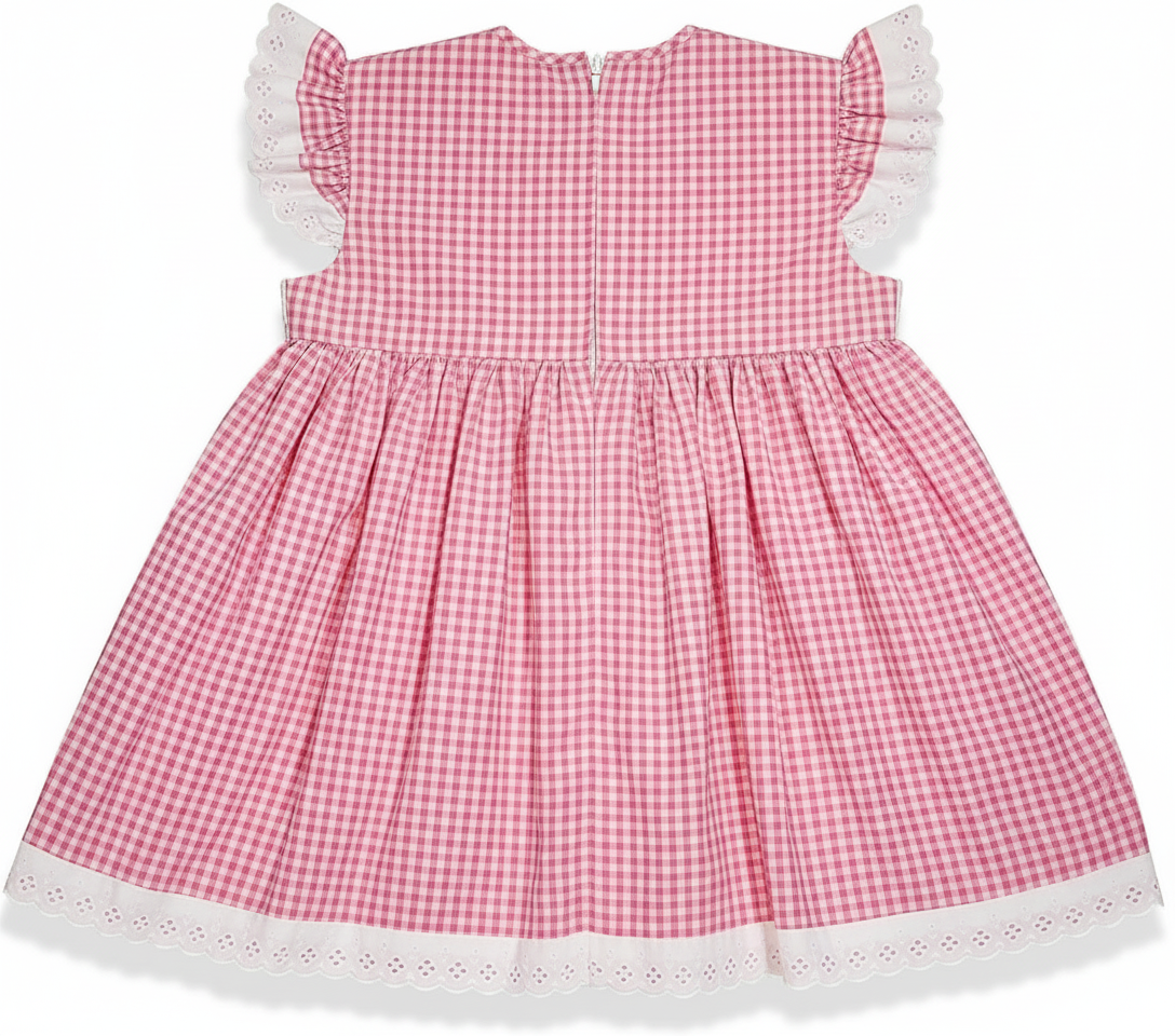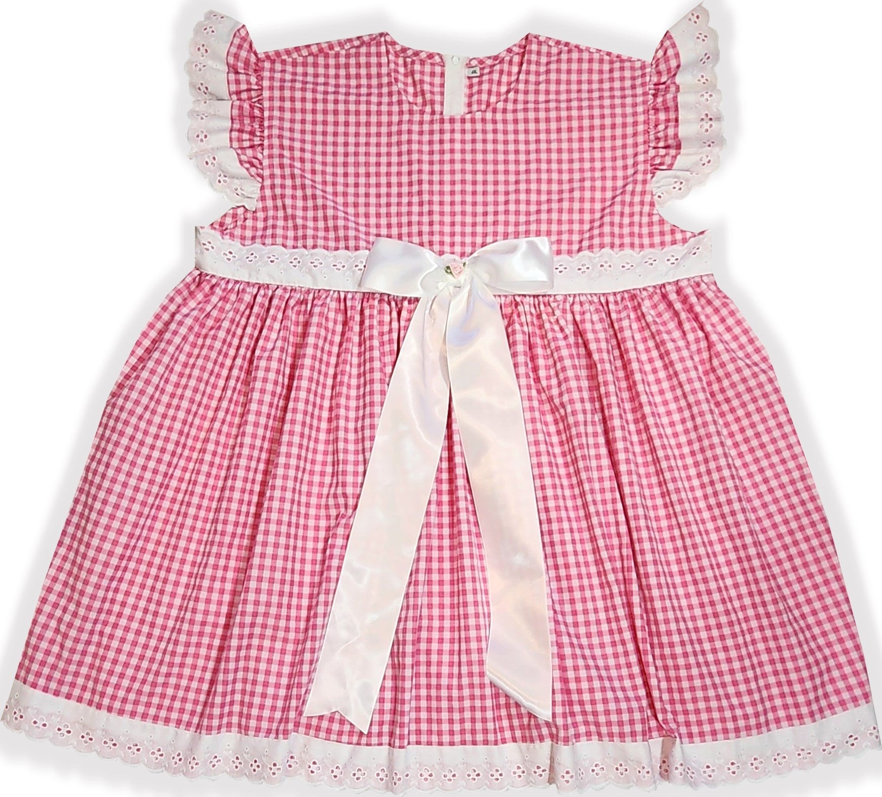 Dress Details: *Made from dark pink and white poly/cotton gingham *Trimmed with white eyelet lace with a long white ribbon bow *Sleeveless baby dress style with empire waistline *Full gathered skirt trimmed with eyelet lace *22" back zipper closure