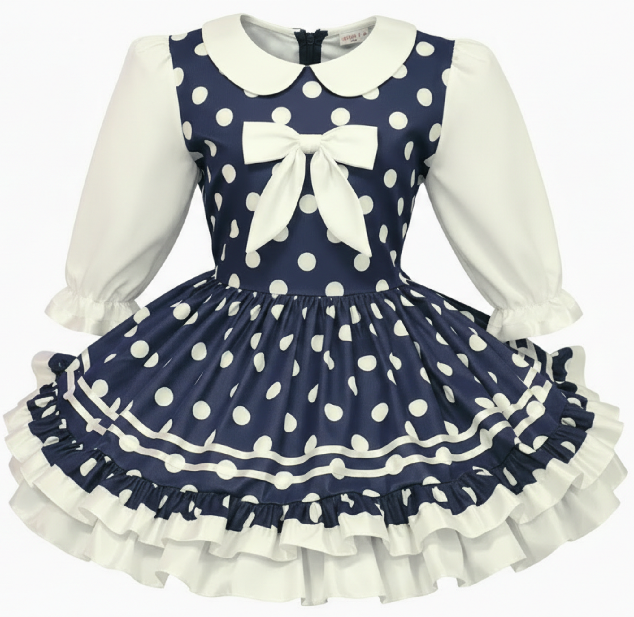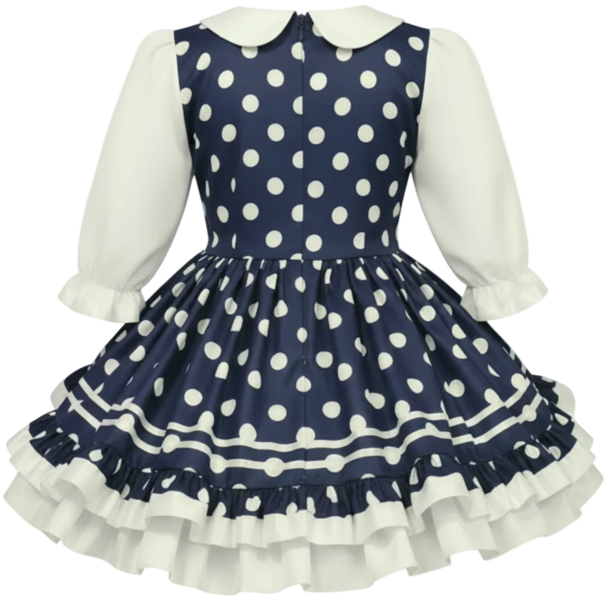 *Made from poly/cotton navy with 1" white polka dots *Trimmed with white ribbon and a bow *Peter-pan collars *Elasticized puff sleeves *Gathered skirt with ruffles and white ribbon *Back zipper closure *Displayed over a mini hoop skirt which is not included *Please allow between 6-8 weeks for delivery *Note: Actual fabric shade, lace pattern style and size, and other trims may vary slightly from the pictures