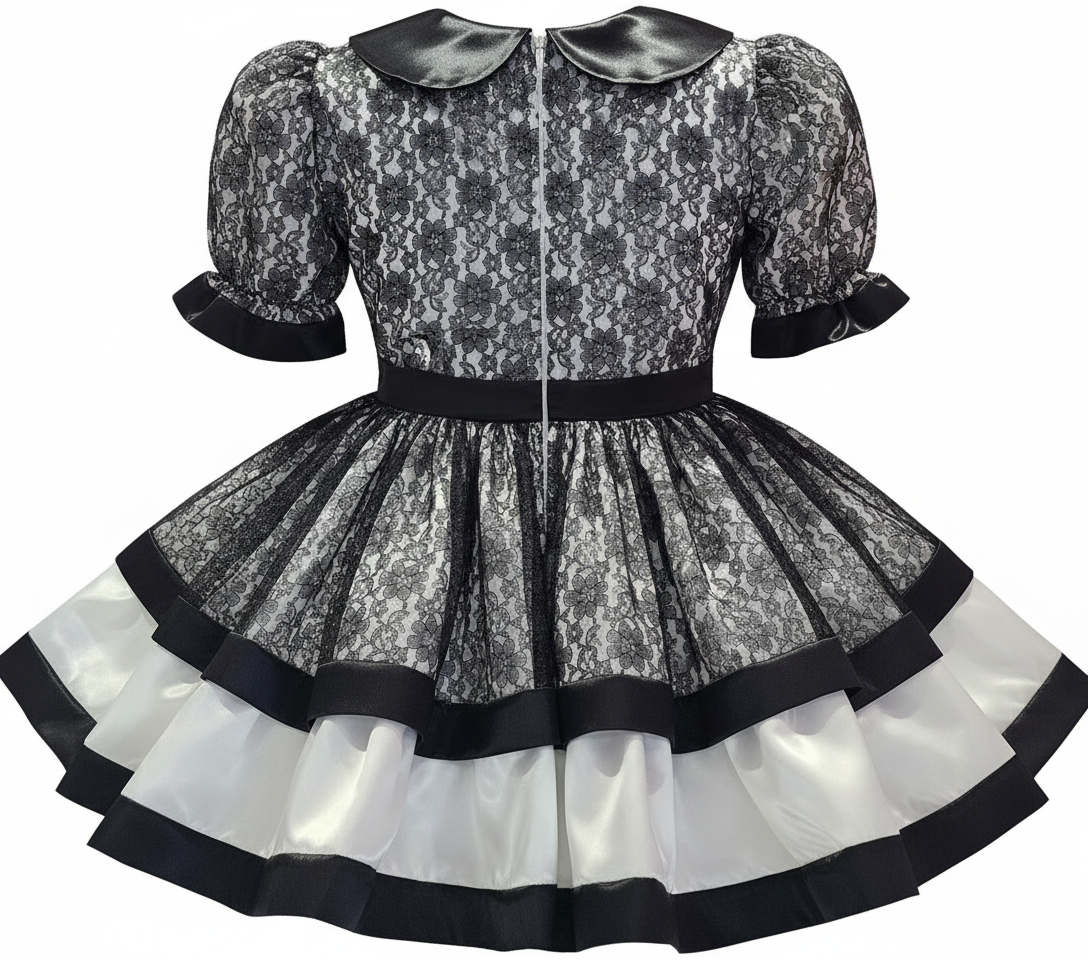 Brielle Custom Fit White Satin Black Lace Adult Sissy LG Dress by Leanne's
