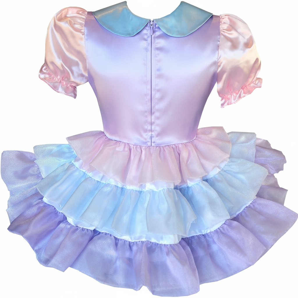 *Made from charmeuse satin in pink, lavender, and baby blue *Blue satin peter pan collars *Elasticized puff sleeves *Ruffled skirt with three rows of sparkle organza ruffles *Back zipper closure *Displayed over a mini hoop skirt which is not included