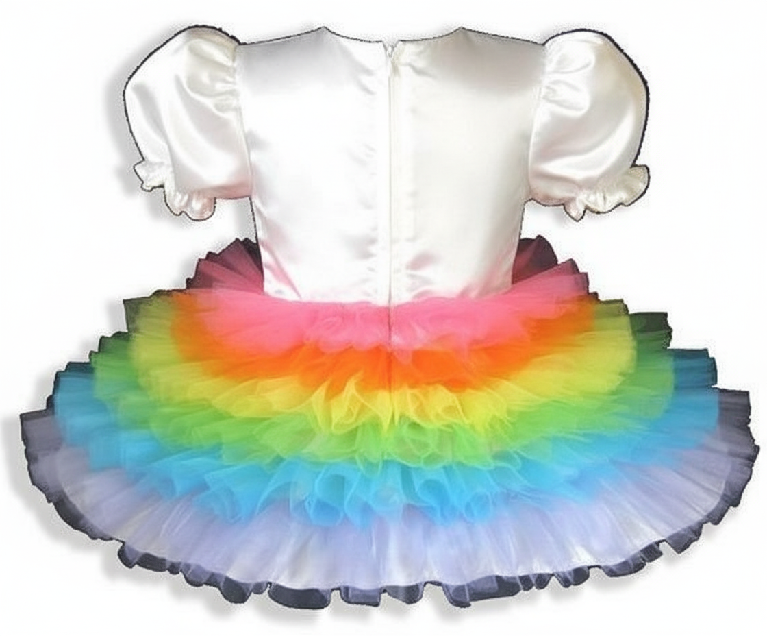 Dress Details: *Made from high quality poly satin in white with rainbow color tulle *Rainbow on bodice with bow *Elasticized sleeve ends for best fit *Full circle skirt with six rows of tulle ruffles *22" back zipper closure *Displayed over a mini hoop skirt which is not included *Please allow between 1-4 weeks for delivery *Note: Actual fabric shade, lace pattern style and size, and other trims may vary slightly from the pictures