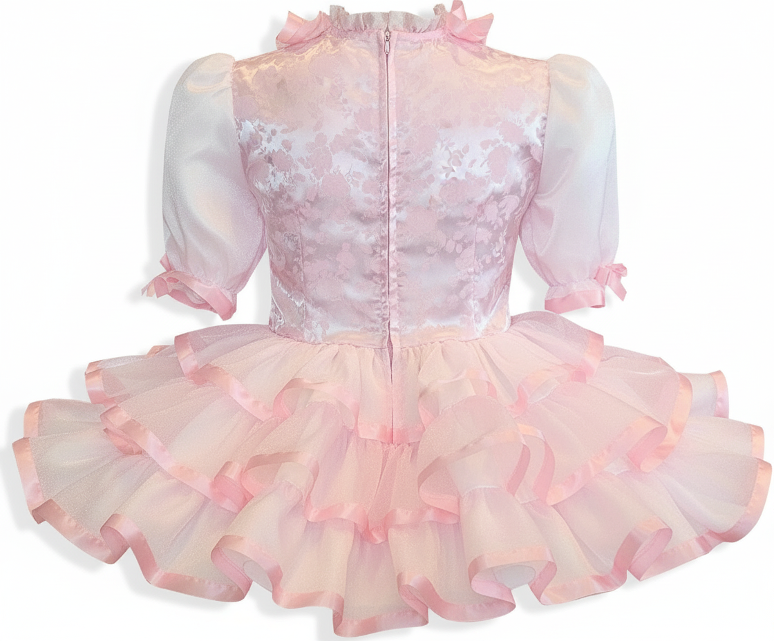 *Full gathered skirt with three ruffles each trimmed with pink satin ribbon